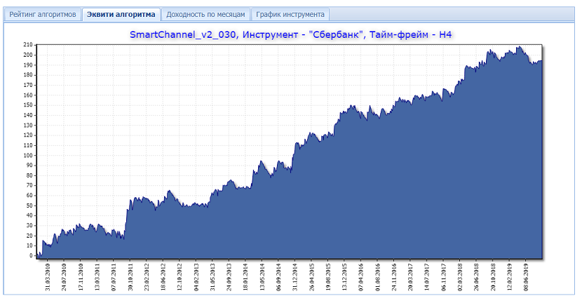 Пример алгоритма SmartChannel_v2_30, который торгуя акциями компании АО «Сбербанк», за 9 лет смог увеличить инвестированные в него средства на +190%. Акции компании выросли в 2.5 раза за этот же период. В результате мы видим, что приведенная в данном примере стратегия принесла немного меньшую доходность, в сравнении с классическим подходом «Купил и держи». Но отдельно стоит отметить, что при этом и величина максимального риска (снижение суммы инвестированных средств) при использовании стратегии значительно ниже, что дает существенное преимущество для инвестора.
