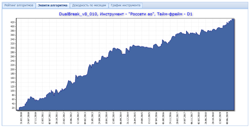 Пример алгоритма DualBreak_v8_10, который торгуя акциями компании АО «Россети», за 9 лет смог увеличить инвестированные в него средства на +435%. При этом акции компании упали в цене фактически в три раза за этот же период. На этом примере хорошо иллюстрируются преимущества системного инвестирования, по сравнению с классическими подходами.
