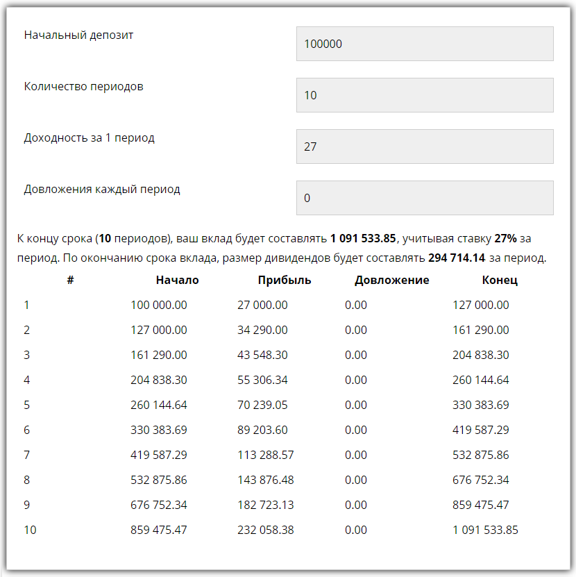 Ниже изображен калькулятор сложных процентов при инвестировании 100 000 рублей на 10 лет под среднегодовую доходность +27%. Конечно же это упрощенный расчет и в реальности доходность инвестирования не будет распределена равномерно, как в случае с банковским депозитом. Но как видно, таких показателей вполне достаточно, чтобы гарантированно обгонять инфляцию, сохранять покупательную способность наших сбережений и наращивать свой капитал.